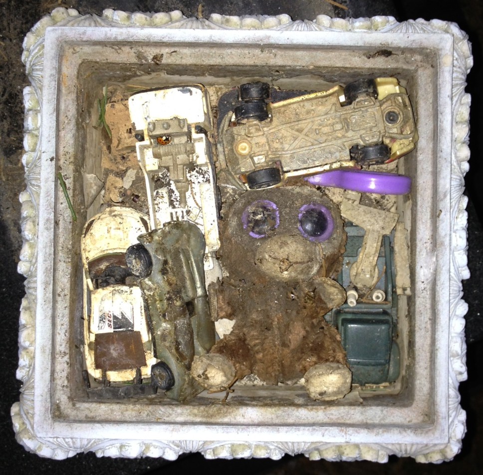 The ordinary items shown above were symbols of grace, hope, and simple sibling love. When his older brother died, my youngest started a tradition of giving his brother a “hug” by sharing what little he had. Words for the sentiment were out of reach but in his hand he held a favorite truck. One by one with each visit to Steven’s grave site the trinkets mounted, the grief lessened, fear became acceptance but most importantly, his faith grew.